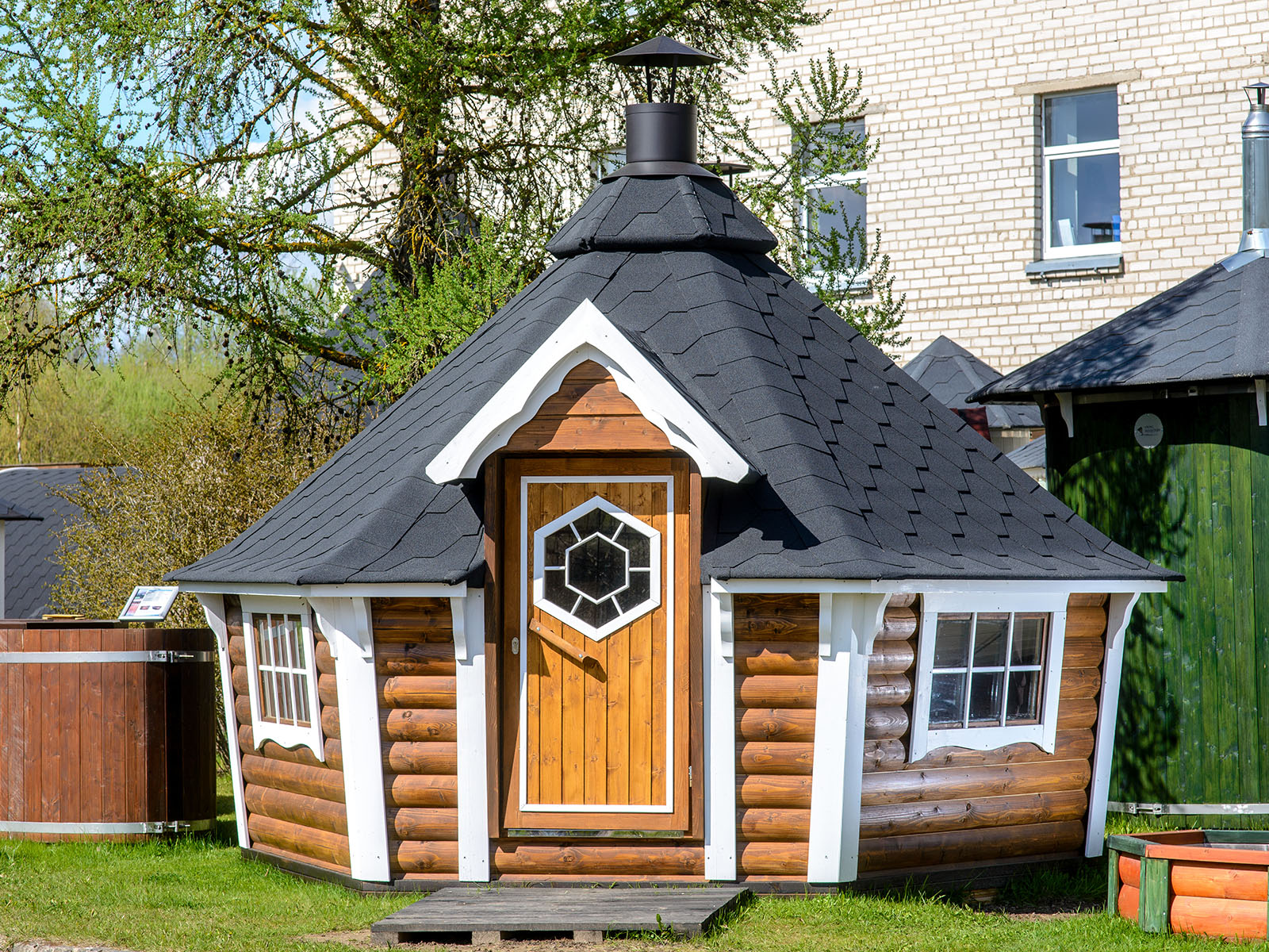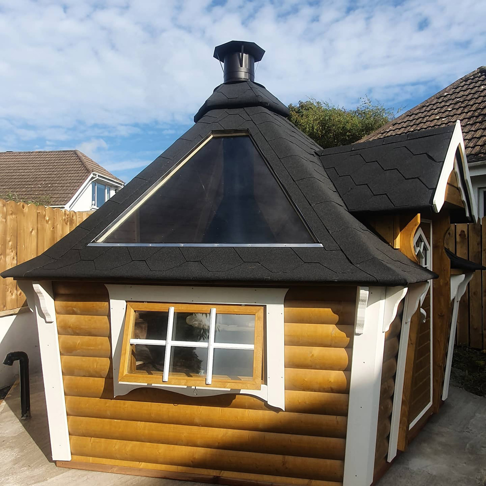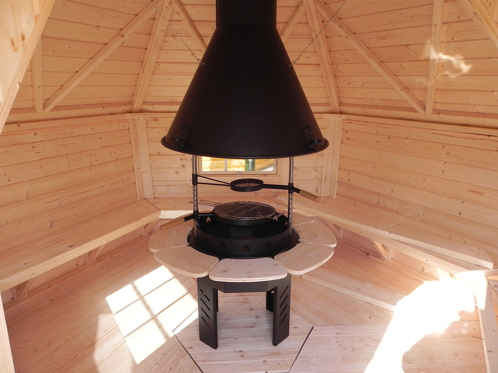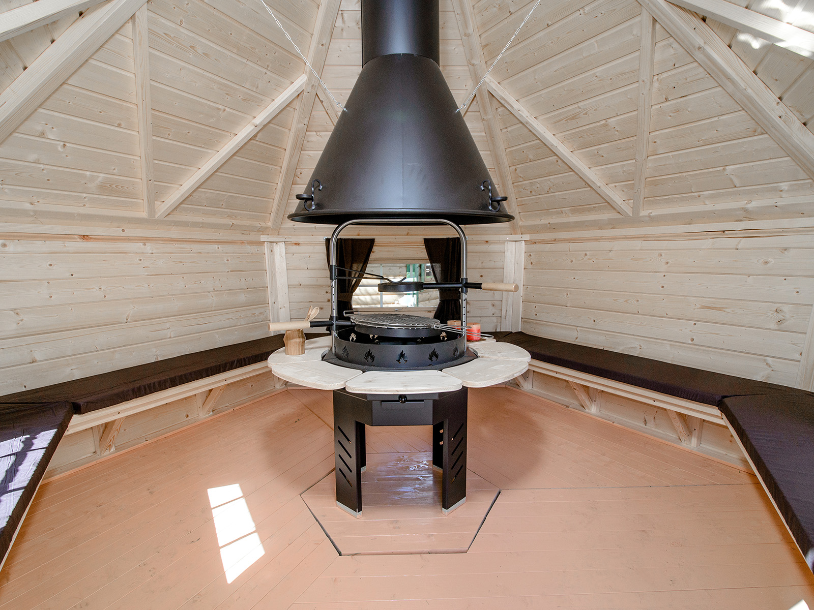 The Viking Industrier Grill Cabin 9.2m² with sloping walls is a premium outdoor structure designed for larger gatherings and year-round use. Crafted from durable Nordic timber, it features a spacious interior with a central built-in grill and chimney, allowing safe and efficient indoor cooking. Surrounding the grill are generous bench seats and a sturdy table, offering plenty of room for family and friends to relax and dine in comfort. The cabin’s octagonal design provides ample space while maintaining a cosy, intimate feel. With double-glazed windows and excellent insulation, the 9.2m² model blends traditional Scandinavian style with modern outdoor living convenience.