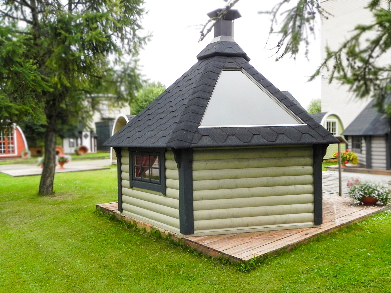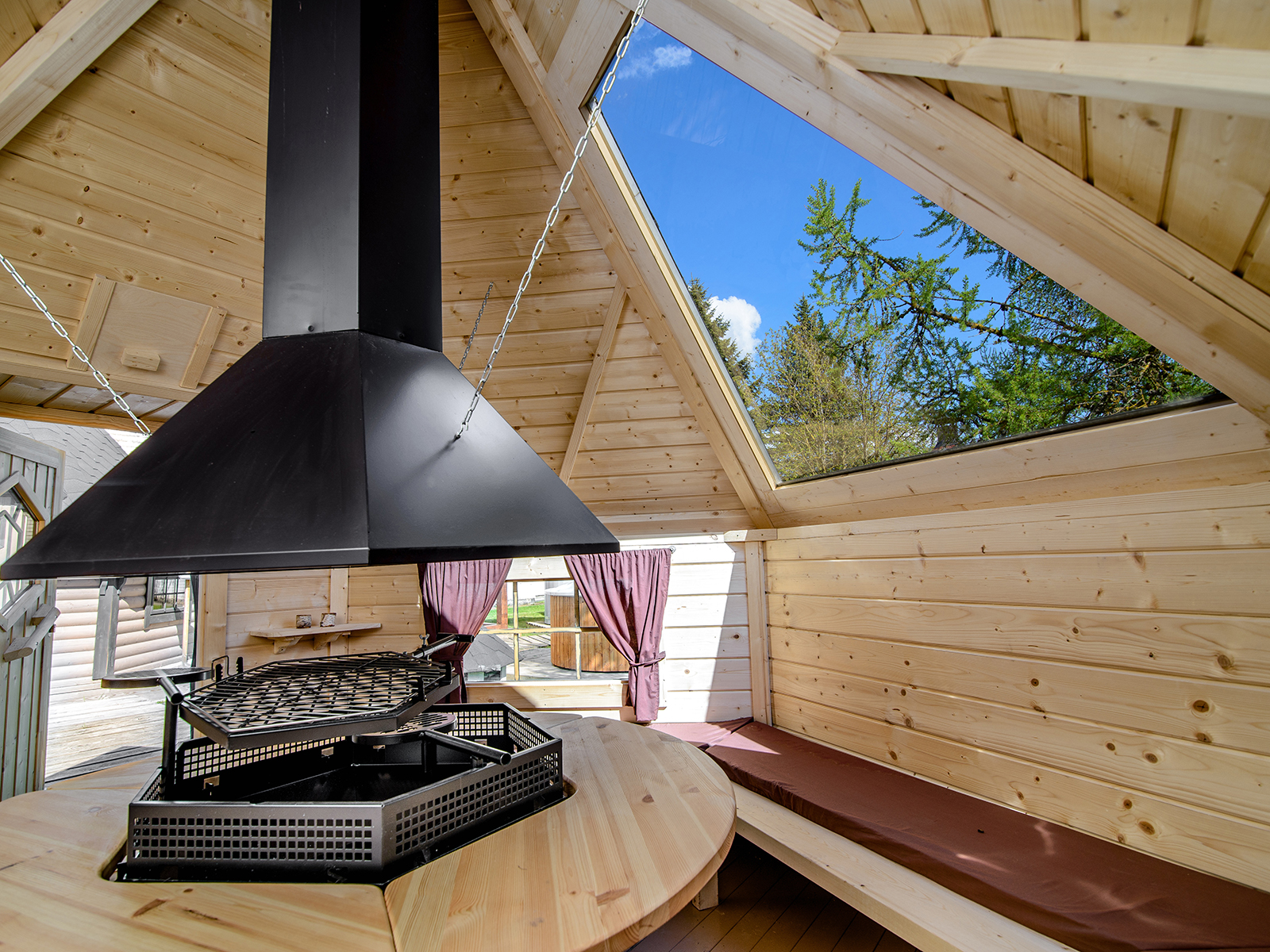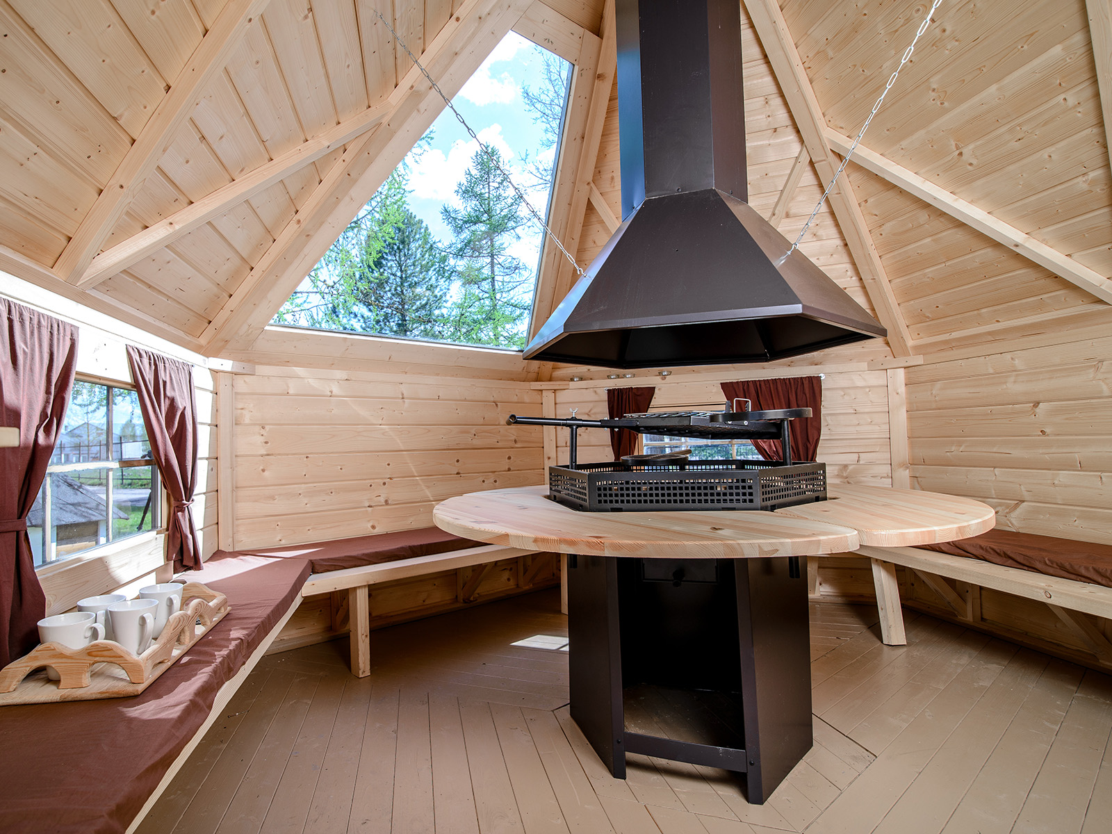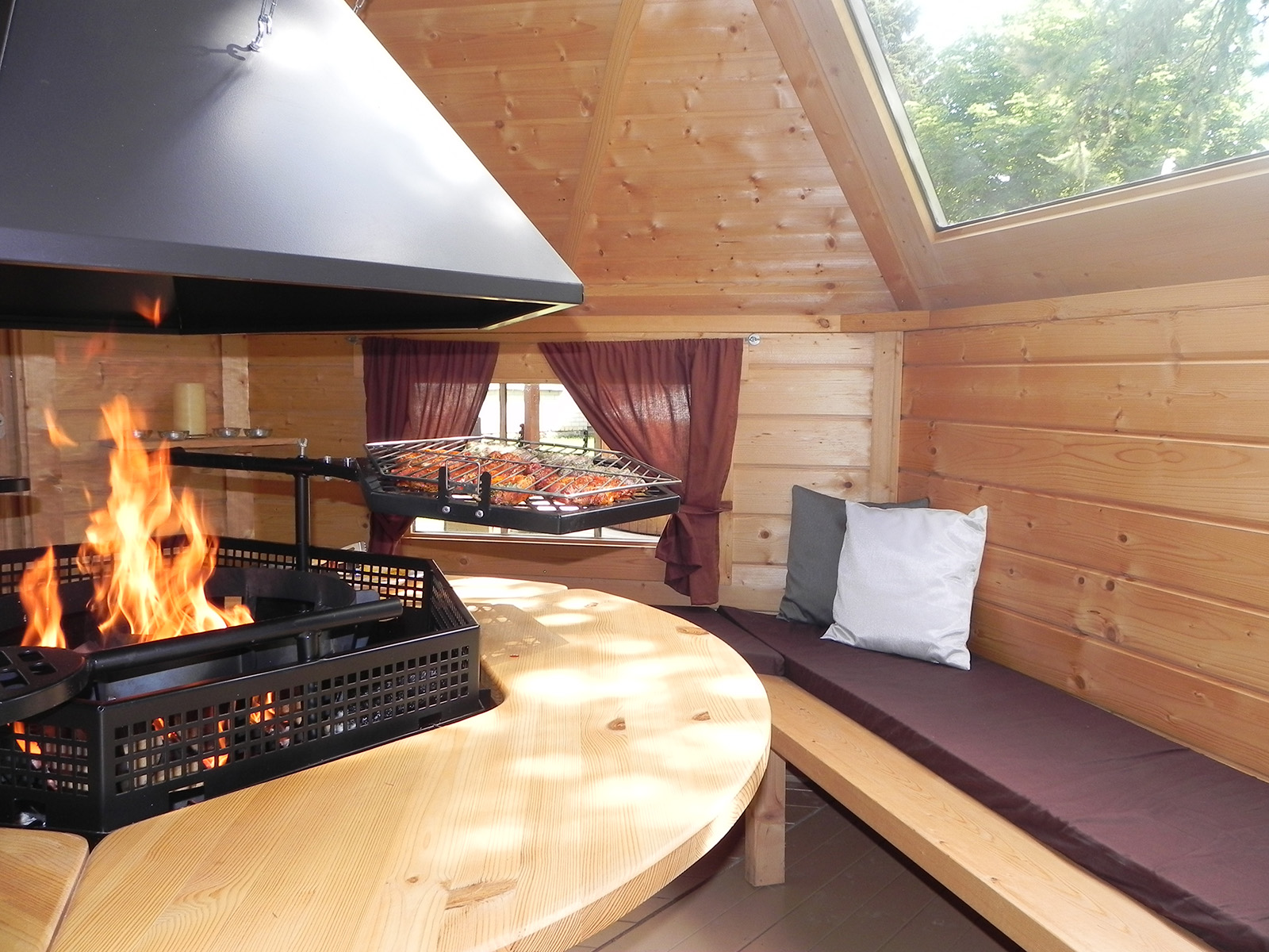 Central grill with cooking platforms and a surrounding table