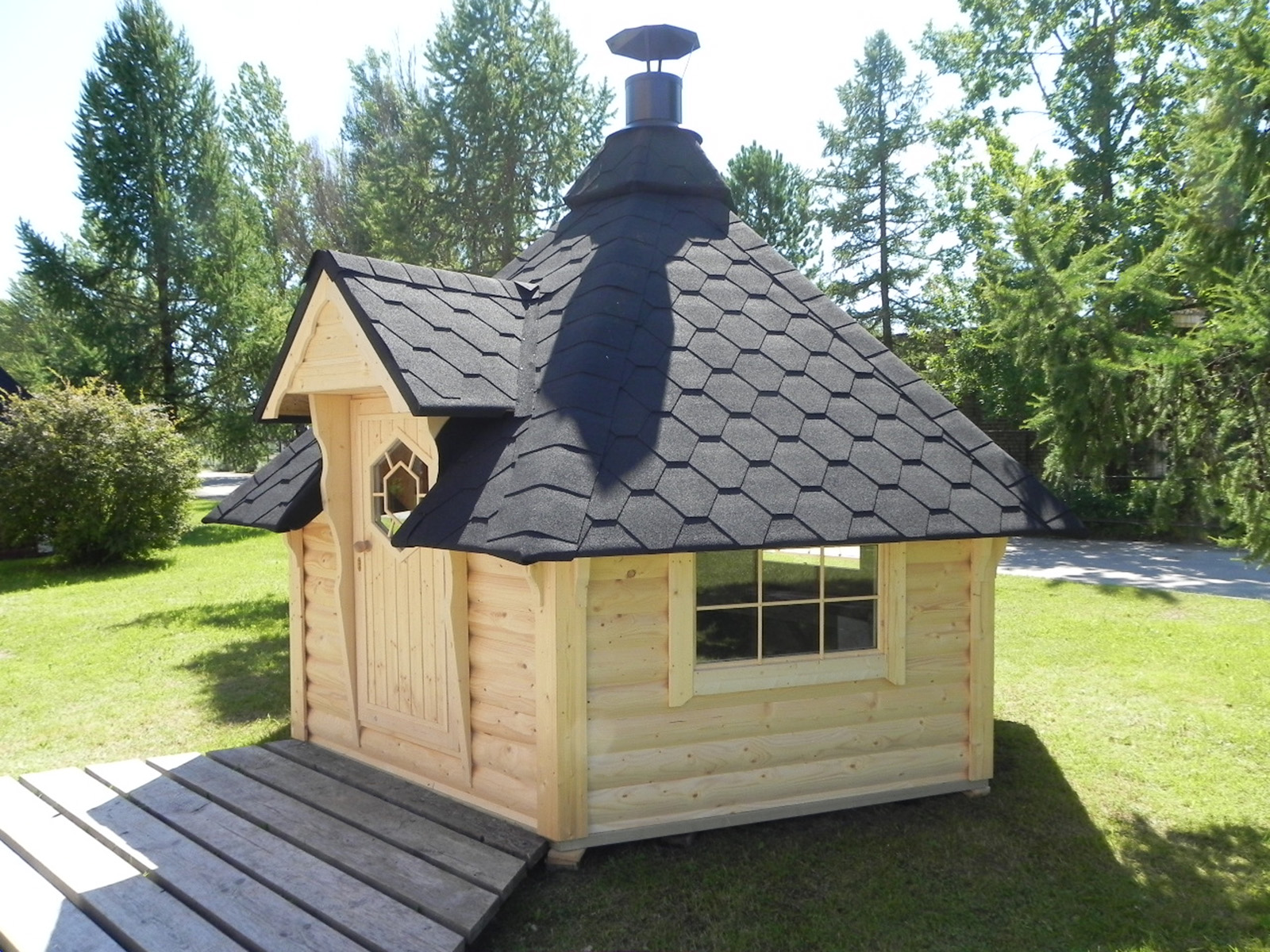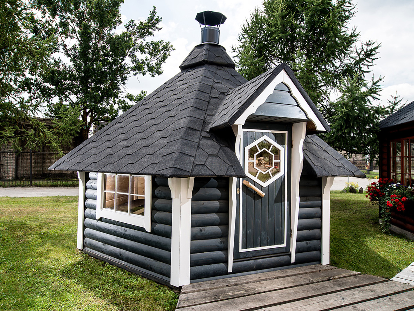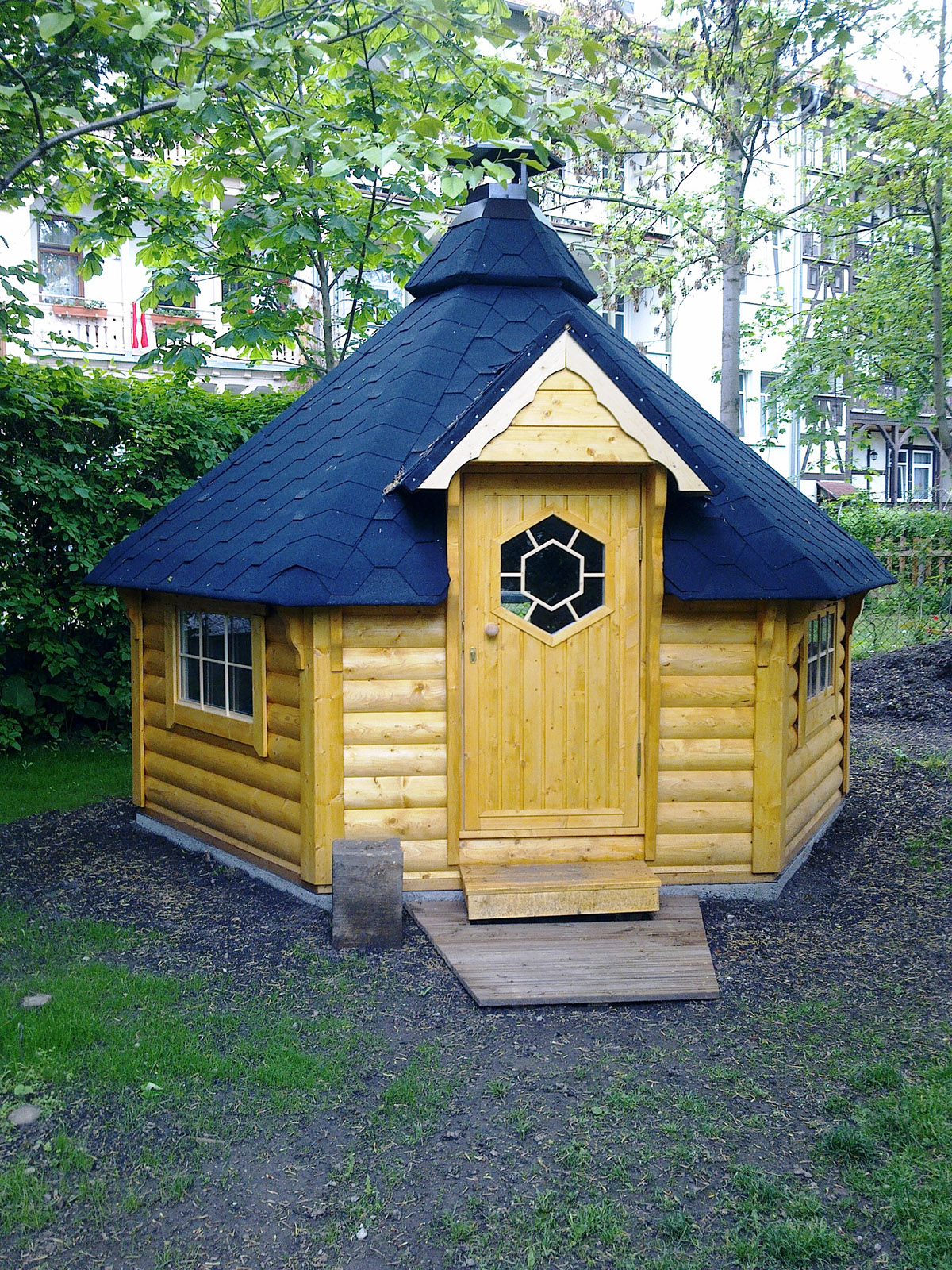 Secure door with lock and decorative hexagon window